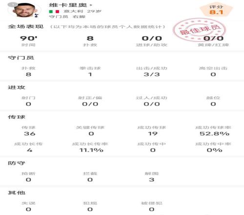 數據顯示,本場比賽維卡里奧除了8次撲救,還有1次拳擊球,3次出擊也全部成功。