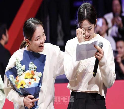 昨晚的比賽后,中國羽協(xié)在賽場舉行了中國國家羽毛球隊運動員退役儀式,陳清晨、鄭思維、黃雅瓊、劉雨辰四位國羽功勛名將在親友和全場觀眾的見證下完美轉(zhuǎn)身,走向人生新篇章。