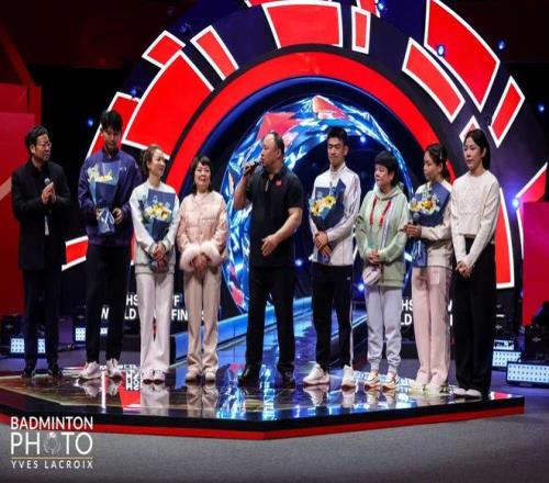 中國羽毛球協(xié)會張軍上臺回憶了和幾位名將的奮斗歲月,祝福他們未來越來越好,并送上組委會準備的瓷器人物版畫。