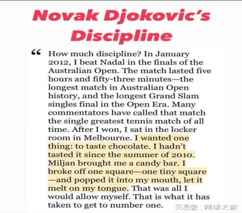 這場(chǎng)比賽結(jié)束后,兩位球員累得已經(jīng)幾乎站不住了。在贏得了這樣一場(chǎng)艱難的決賽后,任何犒賞一下自己的行為都不為過(guò)。但德約科維奇在回顧那場(chǎng)令人難忘的比賽時(shí)說(shuō):“贏下比賽后,我坐在墨爾本的更衣室里。我只想要一樣?xùn)|西:嘗一口巧克力。自2010年夏天以來(lái),我就再也沒(méi)有吃過(guò)巧克力。米利揚(yáng)給我拿來(lái)了一塊巧克力。我掰下一小塊,只有一小小格,放進(jìn)嘴里,讓它在舌尖慢慢融化。