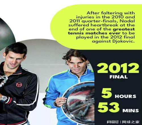 2012 年1月,德約科維奇在澳網(wǎng)決賽擊敗了納達(dá)爾。這場(chǎng)比賽持續(xù)了5小時(shí)53分鐘,這是澳網(wǎng)史上最長(zhǎng)的一場(chǎng)比賽,也是公開賽年代以來(lái)耗時(shí)最長(zhǎng)的大滿貫單打決賽。許多評(píng)論員稱那場(chǎng)比賽是史上最偉大的單場(chǎng)網(wǎng)球比賽。
